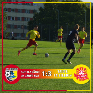 KOHTLA-JÄRVE JK JÄRVE U21 1:3 TARTU FC HELIOSEile õhtul oli esindusmeeskond võidukas ja Kohtla-Järvel tuldi tagasi 3:1 võiduga!!! Meeskonna kapten Robin Grossi kommentaarid pärast mängu: „Seekord pidime meeskonnaga hakkama saama kõige olulisema lülita – meie peatreenerita. Tänase mängu võtmesõnaks oli “meeskonnatöö”. Algusest peale oli meeskond mängus sees ja üksteist pidevalt toetamas. Esimene poolaeg kulges pigem meie taktikepi all ning ainult ühe väikse eksimuse tõttu lasime vastased mängu tagasi. Teiseks poolajaks olime mänguks paremini valmis ja vastased kiire söödumänguga lahti arutanud – tasuks kiired 2 väravat. Tasub märkida, et kõik väravad sündisid suurepärase meeskonnatöö tulemusena. Tänan Jannot kiire valmisoleku eest Simone asendamisel ja kindlasti kõiki mängijaid, kes jätsid endast kõik platsile.” Meie väravaautorid: Aleksander Kattel, Emanuele Uggeri, Janno Jaal . Järgmine kohtumine teises liigas toimub järgmisel pühapäeval (27.09), kui võõrustame Jõgeva SK Noorus 96 meeskonda.